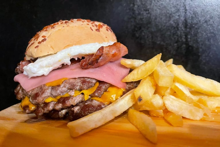 Carne x2, cheddar x2, mayonesa, huevo, bacón, lechuga y tomate